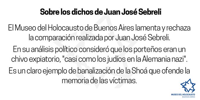 Museo del Holocausto de Buenos Aires: Sobre los dichos de Juan José Sebreli Juan José Sebreli: “El chivo expiatorio actual con el kirchnerismo es la ciudad de Buenos Aires, los porteños. […]