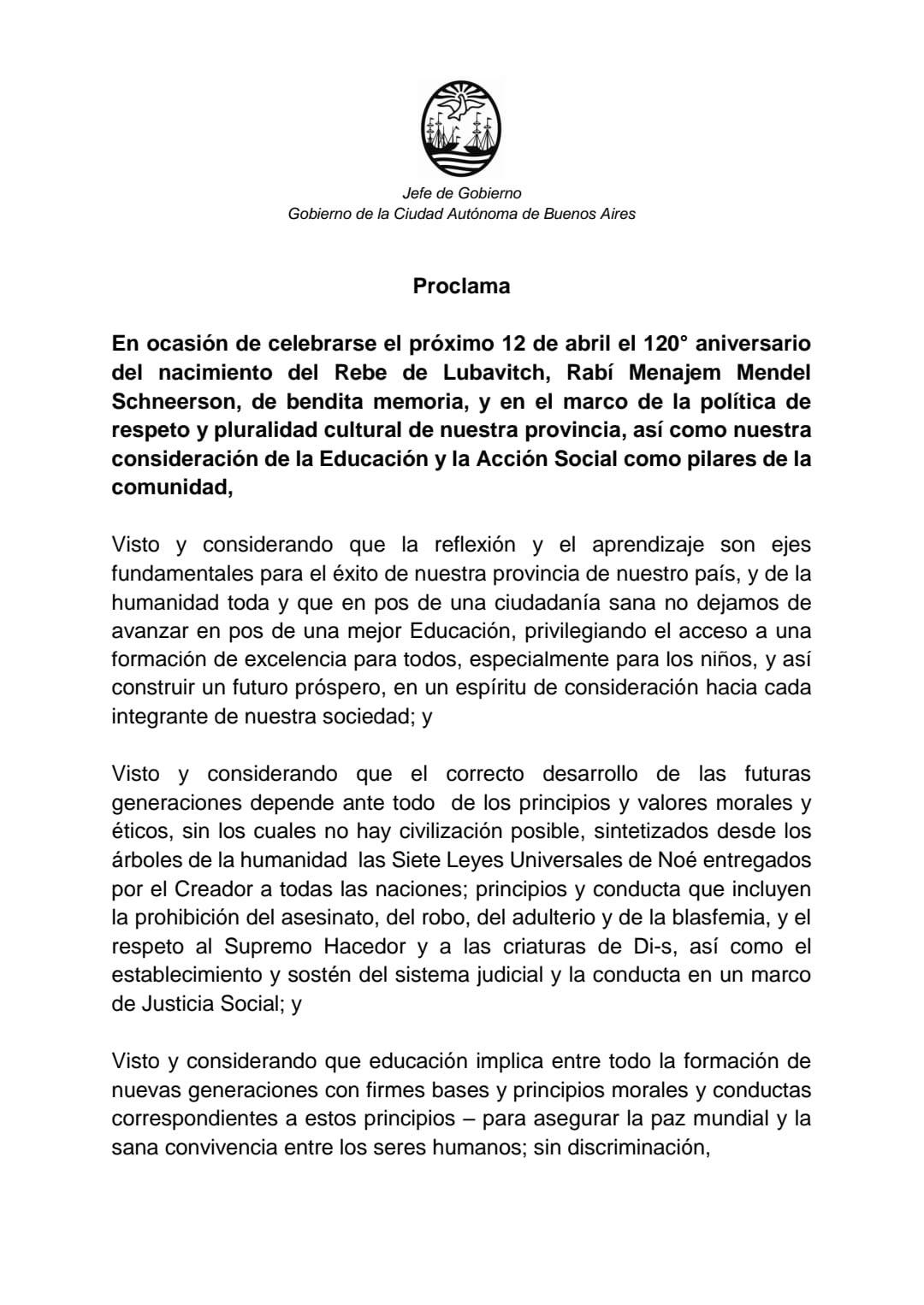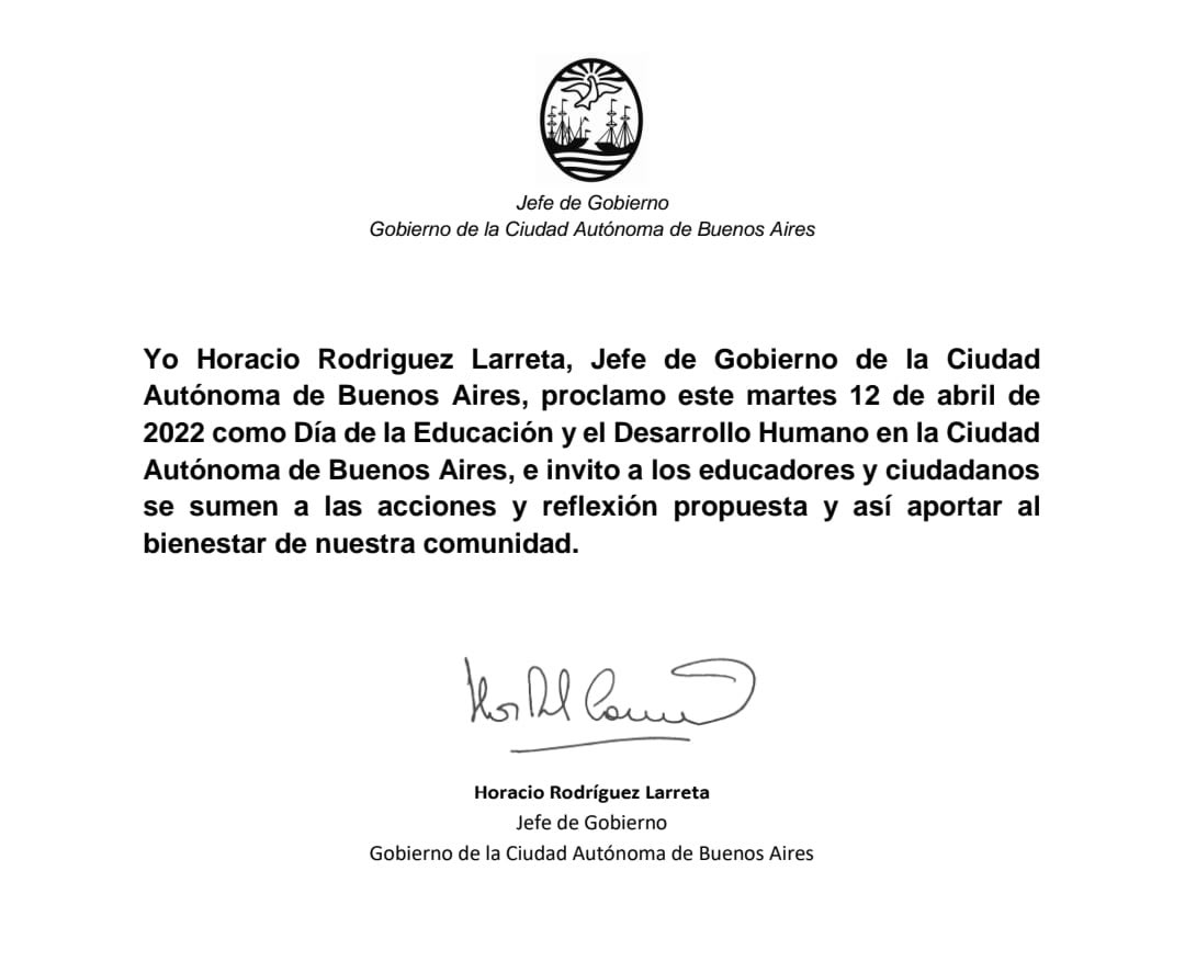 Aniversario de nacimiento del Rebe de Lubavitch: Horacio Rodríguez Larreta proclamó el 12 de abril de 2022 el Día de la Educación y Desarrollo Humano en la Ciudad Autónoma de Buenos Aires.