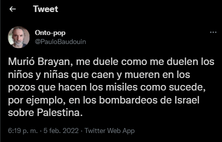 Onto-pop @PauloBaudoui: “Murió Brayan, me duele como me duelen los niños y niñas que caen y mueren en los pozos que hacen los misiles como sucede, por ejemplo, en los bombardeos de Israel sobre Palestina”