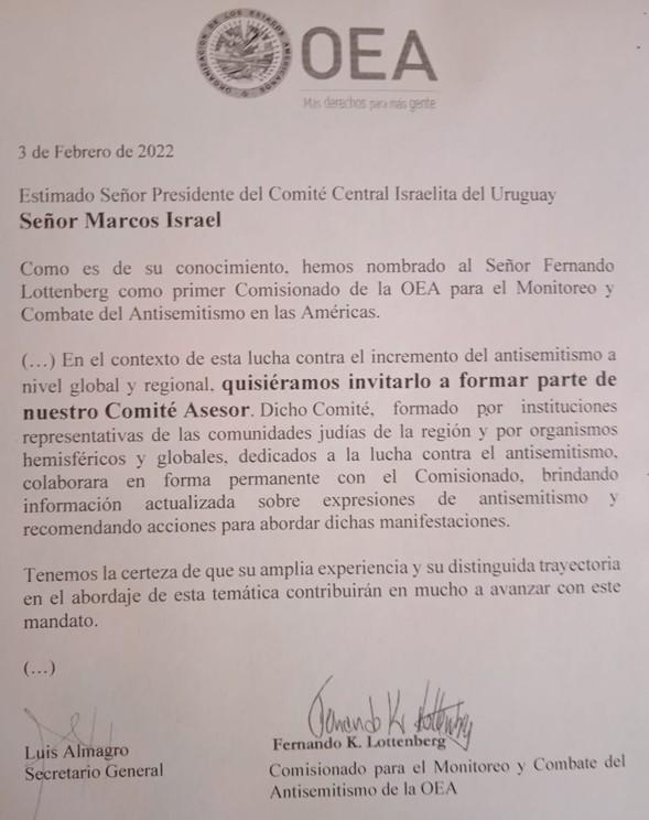 “… En el contexto de esta lucha contra el incremento del antisemitismo a nivel global y regional, quisiéramos invitarlo a formar parte de nuestro Comité Asesor. Dicho Comité, formado por instituciones representativas de las comunidades judías de la región y por organismos hemisféricos y globales, dedicados a la lucha contra el antisemitismo, colaborará en forma permanente con el Comisionado, brindando información actualizada sobre expresiones de antisemitismo y recomendando acciones para abordar dichas manifestaciones” dice la carta invitación.