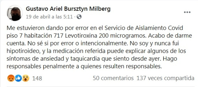 Ayer a la tarde (6 de mayo 2021) falleció en el Hospital Militar Central Cirujano Mayor Dr. Cosme Argerich, Buenos Aires, el médico perito de Gendarmería nacional Gustavo Ariel Bursztyn Milberg, quien para gran parte es desconocido, pero en OPI publicamos una nota el día 14 de diciembre del año pasado bajo el título “Atentaron físicamente y quieren echar al perito médico de Gendarmería del caso Maldonado y Nisman, por denunciar apremios y torturas a detenidos de la Fuerza”, donde retratábamos los padeceres de este hombre que gozaba de una alta estima social y gran reconocimiento profesional.