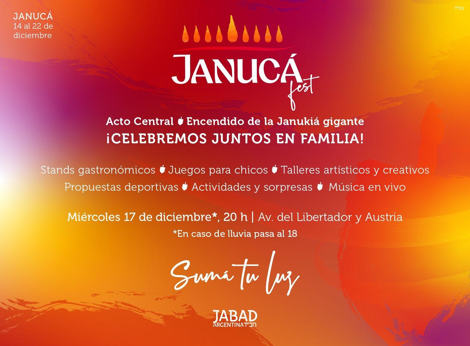 El miércoles 17 de diciembre a las 20 horas será el Janucá Fest de Jabad Argentina. Todos están invitados a compartir esta fiesta familiar que incorpora al tradicional Acto Central y al encendido de la Janukiá gigante de Palermo, una novedosa y variada propuesta de stands gastronómicos, juegos para chicos, talleres artísticos y creativos, opciones deportivas, música en vivo y sorpresas.