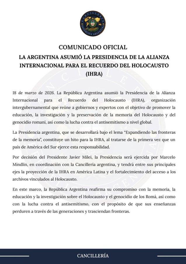 “Argentina asume la Presidencia de la Alianza Internacional para el Recuerdo del Holocausto (IHRA), la primera vez que la ejerce un país de América del Sur. Memoria, verdad y una posición clara frente al antisemitismo”