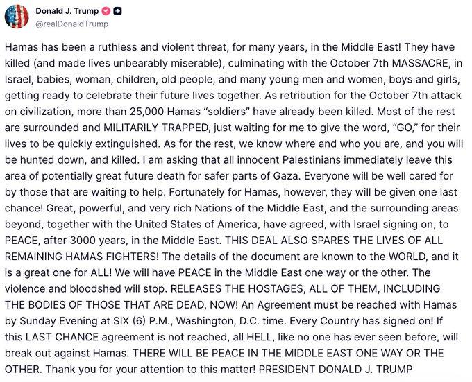 “Tendremos PAZ en Oriente Medio de una forma u otra. La violencia y el derramamiento de sangre cesarán. ¡LIBEREN A TODOS LOS REHENES, INCLUYENDO LOS CUERPOS DE LOS MUERTOS, YA! Se debe llegar a un acuerdo con Hamás antes del domingo a las seis (6) p. m., hora de Washington, D. C….” – Presidente Donald J. Trump