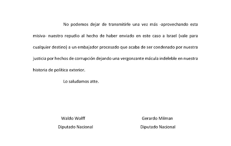 Misiva de los Diputados Nacionales Waldo Wolff y Gerardo Milman enviada a Santiago Cafiero por el silencio de la Cancillería Argentina en representación del Gobierno Argentino ante la trágica andanada de atentados sufridos por el Estado de Israel y por haber enviado a un embajador procesado y que acaba de ser condenado por hechos de corrupción para representar a la Argentina ante el mismo país.